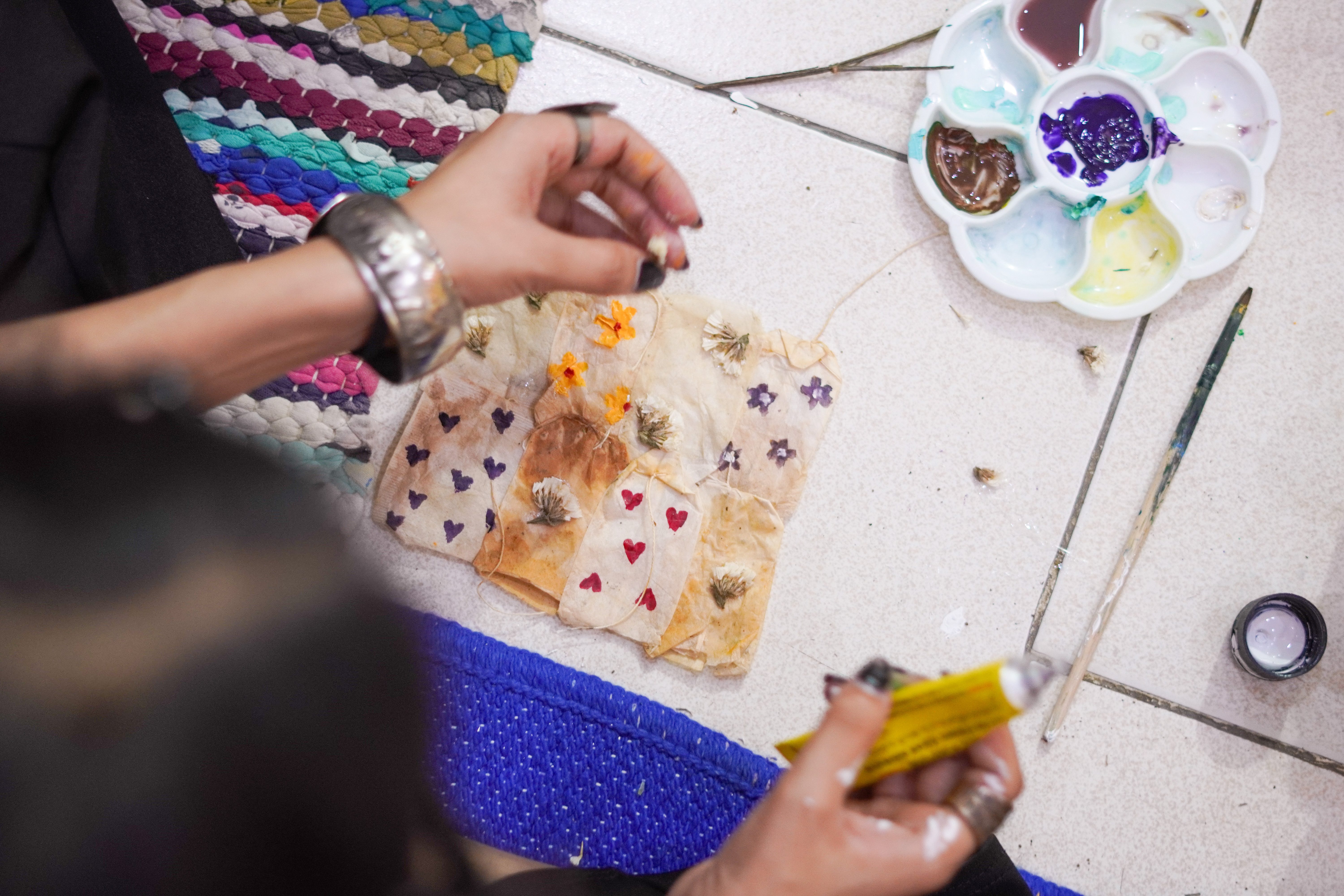 Her work depicts the societal feelings of suffocation, despair that comes with preparing, serving and hosting for family every day by using acrylics, used teabags, flowers, glitter, teacups, skeleton and octopus motifs in her work.