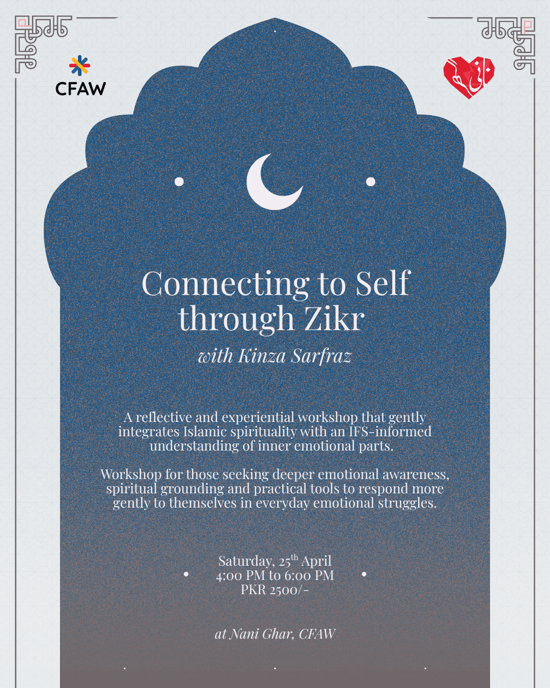 A reflective and experiential workshop that gently integrates Islamic spirituality with an IFS-informed understanding of inner emotional parts. We will be guided to notice the different emotional states within themselves such as shame, fear, anger, sadness or exhaustion and learn how to relate to these parts with compassion, rather than judgment or avoidance.
