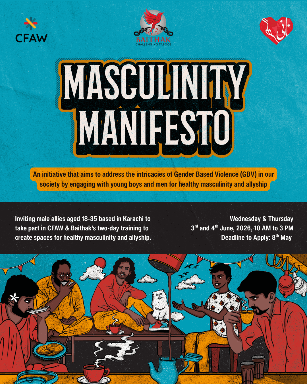 Inviting male allies aged 18-35 based in Karachi to take part in CFAW & Baithak's two-day training to create spaces for healthy masculinity and allyship.