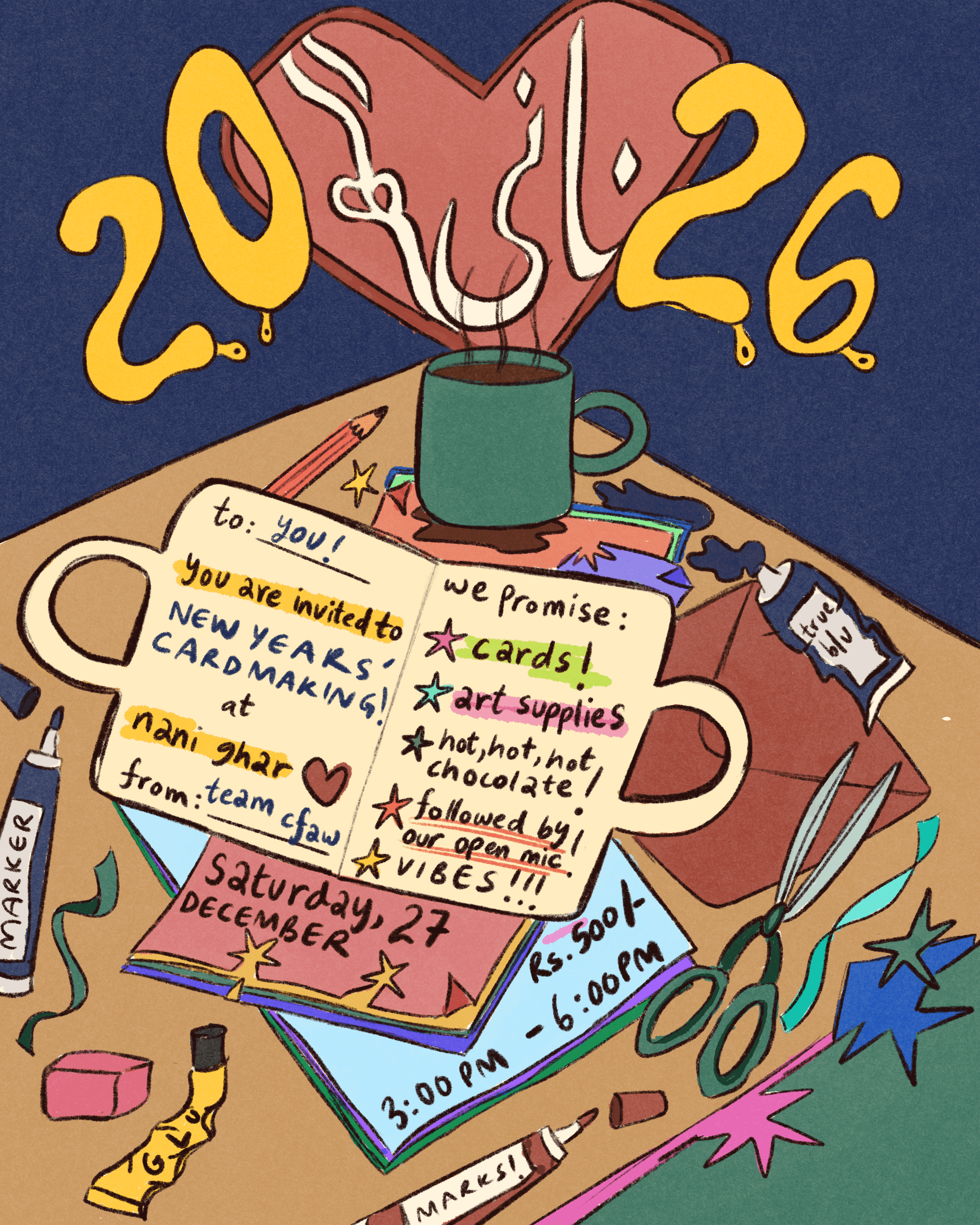 Team CFAW invites you to make new year card with us! Celebrate the new year by making personalised cards for your loved ones, friends, family, or yourself! Join us for art, for the hot chocolate, music and our end-of-the-year open mic after this!